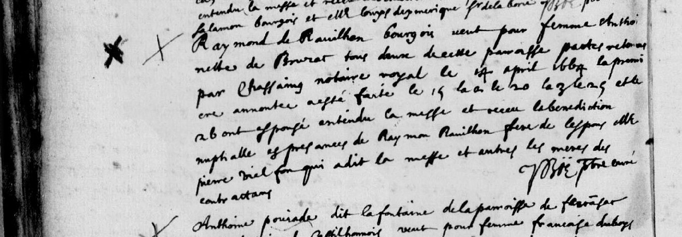 | 17 janvier 2012 à 17:06 | M Raymond Ravilhon x Marie de Resses.jpg (fichier) | 198 kio | 30/10/1654 : mariage de Raymond Ravilhon, bourgeois, et Marie de Resses, pactes retenus par Rey, notaire royal le 20/09/1654, en présence d’Antoine de Resses, père, et de Pierre Ravilhon, oncle, tous deux bourgeois, Archives départementales de la Dor | 1 | |