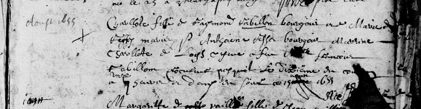 | 17 janvier 2012 à 17:37 | B Charlotte Ravillon.jpg (fichier) | 193 kio | 15/08/1655 : baptême de Charlotte Ravillon, fille de Raymond Ravillon, bourgeois, et Marie de Resses, parrain Anthoine Resses (probablement grand-père maternel de la baptisée d’après ), marraine Charlotte de Loys, veuve de François Ravillon, née l | 1 | |