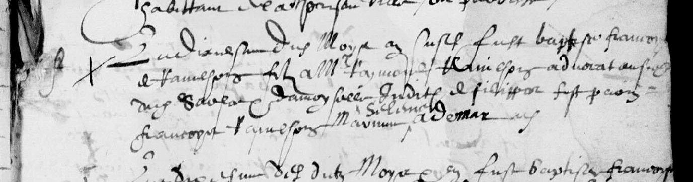 | 11 janvier 2012 à 16:10 | B Francois de Ravilhon 1619.jpg (fichier) | 131 kio | Acte de baptême de François de Ravilhon, fils de Raymond Ravilhon, avocat au siège de Sarlat, et de demoiselle Judith de Filippot (patronyme à vérifier), parrain, François Ravilhon, marraine X (prénom à vérifier) Adémar 10/10/1619, paroisse Sai | 1 | |