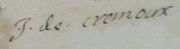 | 6 octobre 2008 à 07:58 | Signature de Joseph de Cremoux.JPG (fichier) | 10 kio | Signature de Joseph de Cremoux datant du 12 avril 1669 trouvée sur l'une des copies du contrant de mariage d'Anthoine de Cremoux qui se trouve aux archives départementales de la Dordogne à la cote 12 J 2. | 1 | |